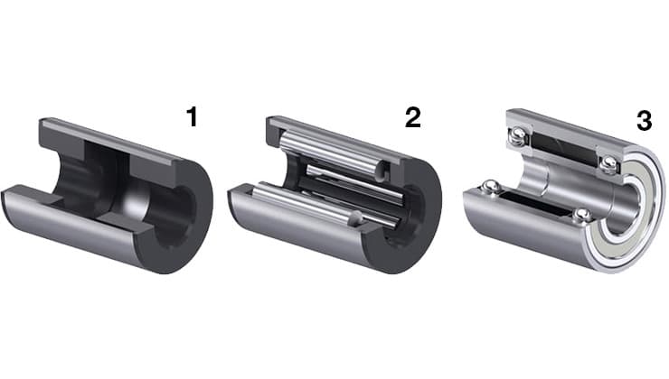 Cojinete liso (1) El cojinete liso es un cojinete de rueda sencillo, económico y robusto. Además, es resistente a la corrosión y no requiere mantenimiento en condiciones normales de funcionamiento. En condiciones especiales - por ejemplo, sequedad, alto contenido de polvo en el aire o elevado kilometraje - se recomienda la lubricación con grasa o aceite.