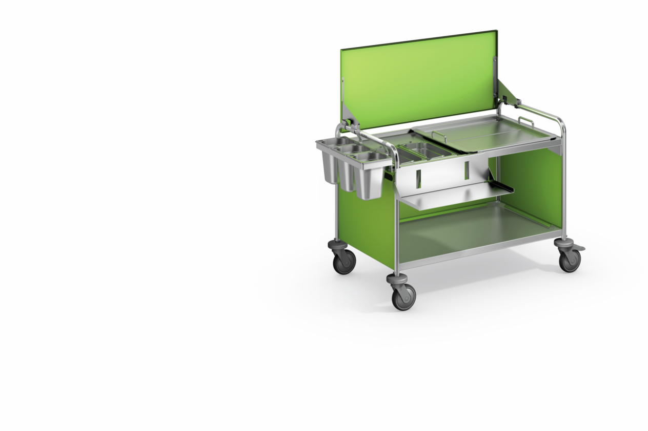 Mobile clearing station with 2 shelves (1000 x 600 mm) and cut-out for waste containers on the top shelf.Welded shelves, incl. 4 gusset plates on the top shelf and 2x GN-B 1/3-150.